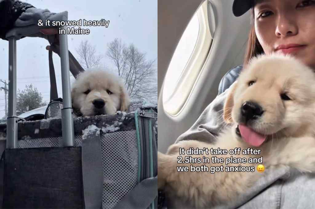 Instagram user @maui_thegoldenpup documented their 24-hour journey to bring home a Golden Retriever puppy named Hugo. The video opens in snowy Maine, where Hugo is tucked inside a soft carrier bag, ready to travel. As they make their way to the airport, onscreen text reads, “First time seeing the outside world,” as the curious pup peeks out, taking in his surroundings for the first time.